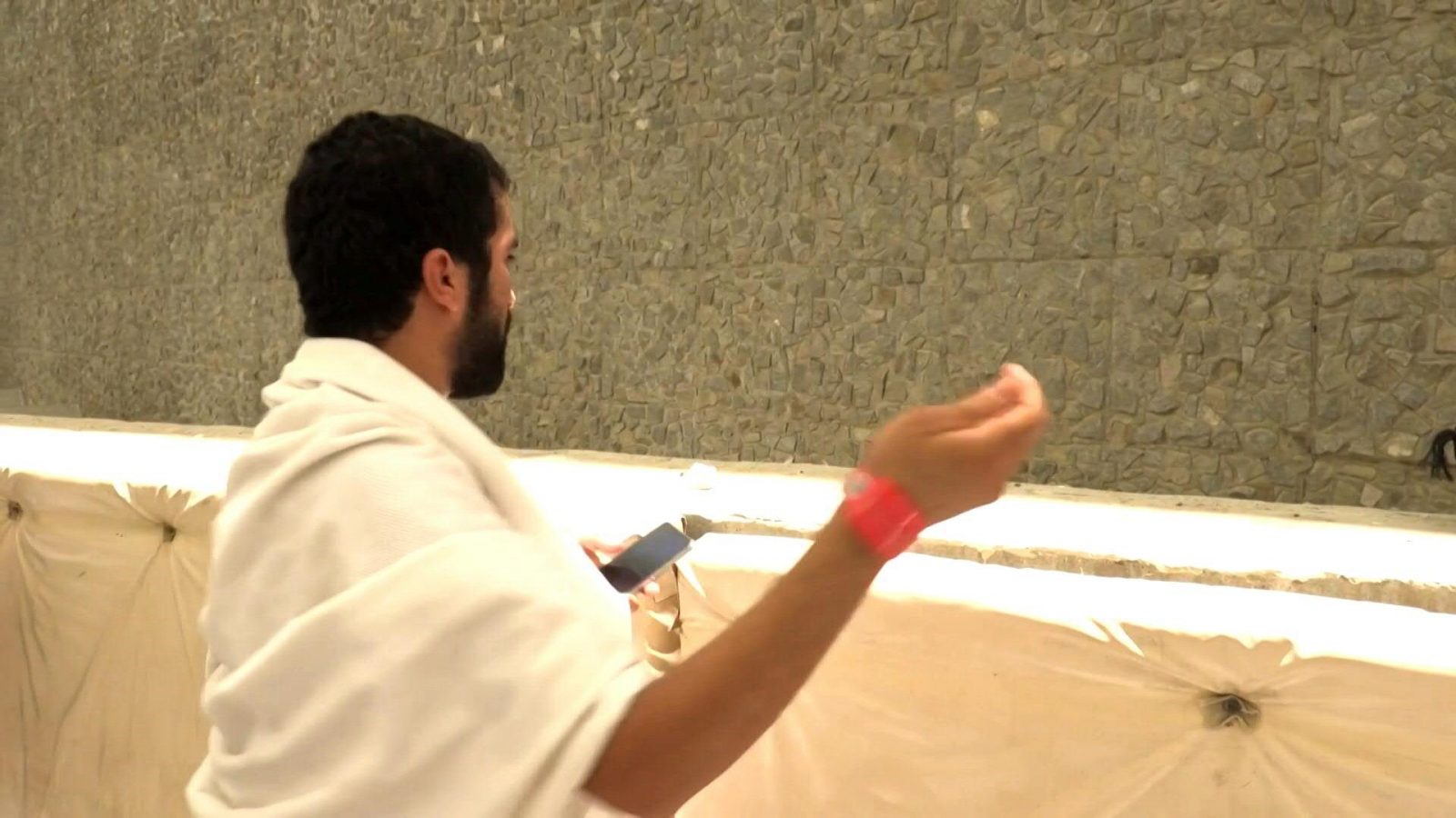Many pilgrims walk with umbrellas to shield themselves from the sun, while others carry their folded prayer blankets above their heads.